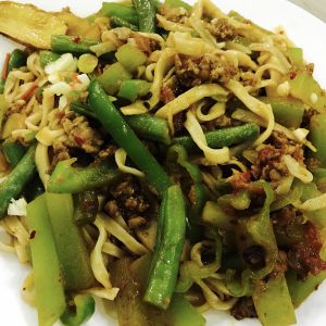 香辣青笋豆角番茄双椒肉丁炒面