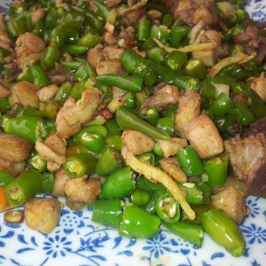 鸡腿切丁,切小一些好如味更好吃。七星椒切小段