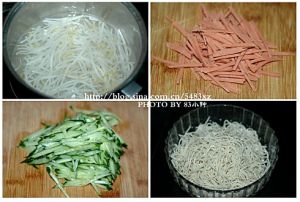 绿豆芽洗净焯水后过凉沥干水份备用。黄瓜,火腿肠切细丝。凉面装入稍大些的容器,加入处理好的绿豆芽,黄瓜丝,火腿肠丝,淋上步骤1调好的料汁,撒上咸萝卜丁碎,葱花,吃之前拌匀即可。