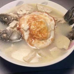鱼煎好后,把烧好的水倒进锅里,等锅里的水沸开,豆腐轻掰成块放锅里煮,把煎好的蛋放鲫鱼上,水沸开后关盖小火煮十五至二十分钟。