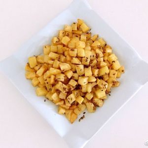 开火,锅内加入少许食用油,放入土豆煎至变色变软