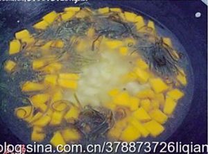 加入自制高汤、笋丁、海带烧开滚8分钟左右下盐调味即可。
