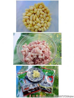黄豆泡好、花肉切细碎、葱蒜剁蓉、青椒切粒备用;
