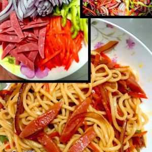 锅内放油,十三香,炒下配菜,再放入面条,调入酱油,盐,耗油,添少许汤,翻炒均匀即可出锅