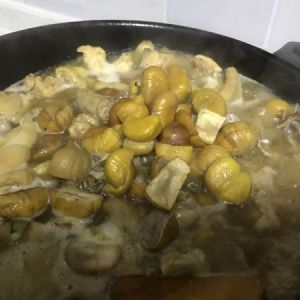 再加入蚝油调味,,加入拨好的板栗,继续翻炒后加水炖二十分钟(炖之后想要快一些可以放入高压锅)