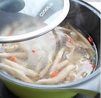 下海鲜菇,烧开,加盐调味,滋补的菌菇牛髓汤就做好了。