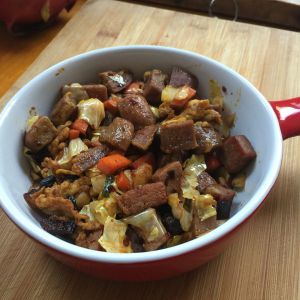 将前面炒好的馒头丁倒入,放一点糖提鲜,因放有双酱和生抽,所以可根据自己口味放盐。