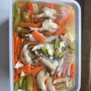 小米椒两袋的椒水倒入保鲜盒,倒入一袋小米椒即可,把一个鸡手切成3小段,放入保鲜盒,把蔬菜倒入,用手抓匀。最后把煮好的花椒水倒入。尝一下汤的咸淡,可适量放点盐。