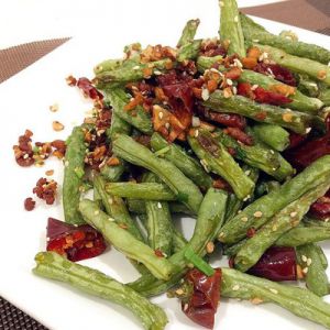 等到四季豆表皮皱起来了就可以下干辣椒 芝麻 盐 (一小勺应该就够了)少许糖 葱花 翻炒几下就可以出锅了 …
