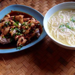 鸡腿煮熟捞出过凉,斩块装盘,撒上葱蒜末
