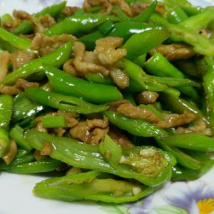 最后把辣椒放进去炒,直到辣椒熟了,放葱下去再炒一会,然后起锅装盘。