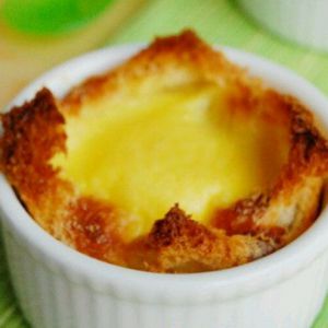 4、把蛋挞的蛋奶液舀入土司碗盅里;