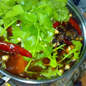 最后锅在加入分量足的混合油(猪油 籽油).烧熟待油温低后加入炒好的红汤料,泡椒几只,大蒜,炒一下淋入火锅上面,加芹菜就准备上桌开煮啦