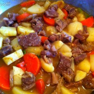 牛肉块洗净焯火,放入锅中加入除咖喱之外的其他辅料煮至八成熟,放入土豆块和胡萝卜块煮熟,加入咖喱块调匀即可。
