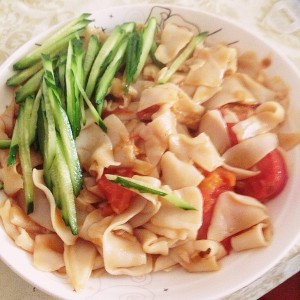 加入煮好的面片,中火翻炒,加入精盐花椒等调味,这时注意一定要不停翻炒防止粘锅,五分钟左右盛盘即可!但是我又切了半根黄瓜丝解腻,看看刀功还不错哈-_-#