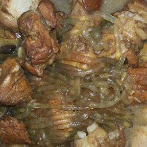 将备好的食材洗净,肉要切成2-3cm长方形,葱切段,姜切片,粉条用温水侵泡两个小时。