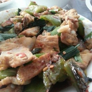 回锅肉捞出冷却后切片,然后切大葱叶子。