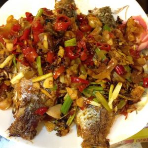 煎至金黄捞起。用锅里多余的油炒香葱、姜、酸及酸菜辅料,待炒香放入煎好的鲫鱼,加入高汤或者温开水,收汁完工。
