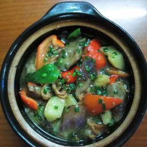 砂锅放水土豆垫底,茄子放在上面,调味后煲熟。