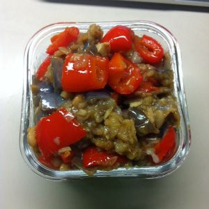 锅中油留一点。下葱蒜爆香。我好像还放了点洋葱末。洋葱末能加速茄子皮松软的速度。