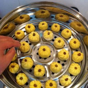好啦,小南瓜上面的纹是我小勺子一个一个摁上去的。会有点费事,不过好看。上锅蒸20到30分钟就好啦
