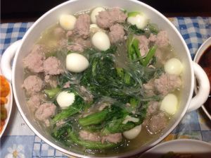 另外取一个砂锅,里面加入水,肉丸,鹌鹑蛋和鸡汤精(时间有限,没自己熬高汤,这还是比较方便的),汤煮滚以后加入粉丝和苔菜搅拌均匀,出锅前加少许盐和香油提味就可以了。