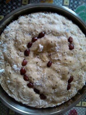 先把红豆加适量的冰糖用电压力煲煮一个小时。把红枣切碎。把鸡蛋打到起泡,再逐一加入红豆,红枣,葡萄干,加入100毫升水。再加入适量的面粉。搅拌均匀发酵1个钟!上5锅蒸先再在上面洒上一些椰子丝。再用红豆摆出一些自己喜欢的造型!就大功告成了