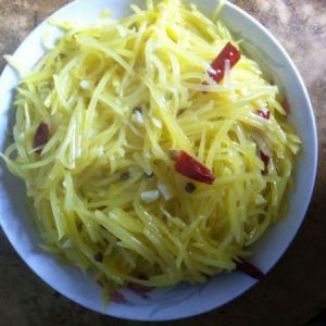 放入切好的土豆丝翻炒,放入盐、味精、白醋。