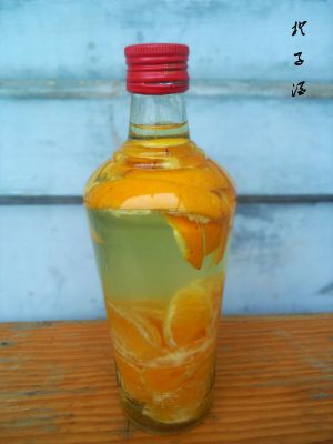 玻璃容器里加入果肉、橙皮和冰糖,倒入米酒,密封好。