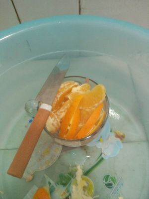 橙子冲洗一下,表面撒盐,搓洗干净。