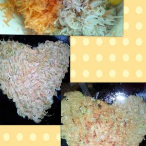 分别将土豆胡萝卜去皮洗净并擦碎,放入小盆儿中