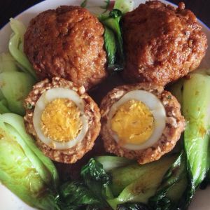 4.鸡蛋是事先煮好的,冷却后将剁好的肉裹在外面(裹的时候最好手心蘸点水,这样不容易将肉粘在手上)。