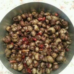 油热后,先放田螺爆炒,后加入辣椒粉,孜然粉,干辣椒段,约5分钟