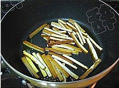 锅中倒入油,大火加热至六成热时,倒入豆干,转成中火,煎至豆干的表面出现金黄色气泡儿时盛出。