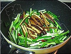 去除韭菜尖上的黄叶,外面的老叶,洗净后切成4厘米长的段。烟熏豆干也切成相同大小的段,干红辣椒用纸巾擦净表面浮土备用。