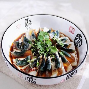 将红油汁倒在摆好盘的豆腐皮蛋上,散上寸段的香菜即可.