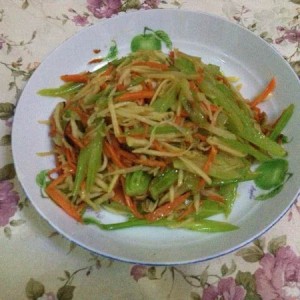 土豆,胡萝卜切丝备用!芹菜切丝,过水焯一下,备用!热锅放油,先放入胡萝卜丝翻炒至焦黄!