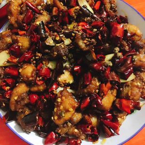 锅留底油 爆香葱蒜 辣椒段 麻椒花椒后。放入炸好的鸡胸肉炒。撒入白糖和芝麻 少许盐 出锅
