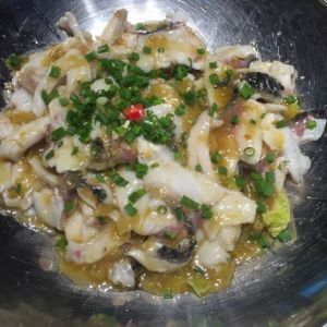 起油锅,加入葱头,青花椒,辣椒爆炒出香味,再加入少许酸菜汁,后把焯好的包菜跟鱼片入锅,让鱼片和菜充分吸取,酸菜和青椒的味道~而后撒上葱花,即可