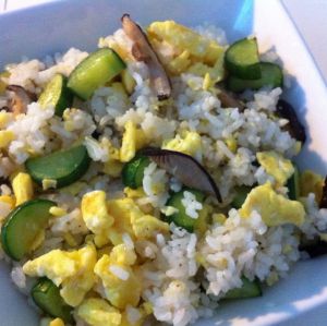 炒熟黄瓜香菇豆干(任何你喜欢的食材都可以下)加点点盐。