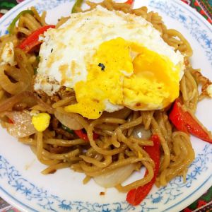 先放入肉丝翻炒,变色即可,再放入青椒和洋葱翻炒,炒熟后放入拌好的面条,炒匀即可