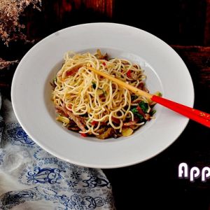 面条在炒制过程中,水份略失,这样可使面条更筋道,根据你自已的喜好,就可以加一点味极鲜或酱油了。注意不要加多,因为榨菜本身有盐份,肉丝我们也已经腌制给过底味了。