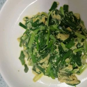 热锅起油,葱花、姜丝稍炒,放入已拌匀的鸡蛋韭菜,立即翻炒,出锅。