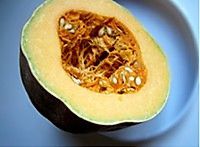 南瓜削皮,用不锈钢勺挖除软肉层的瓜瓤,切成小块备用;