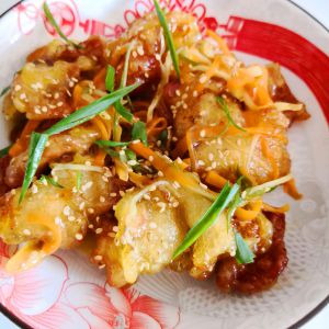 锅内留少许有,下入胡萝卜丝和姜丝爆锅,导入糖醋汁,家少许水淀粉,待汤汁浓稠,下入炸好的肉翻炒片刻出锅,撒少许葱丝。