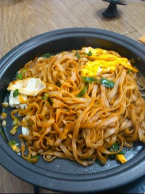 接下来就可以把面夹进去然后浇上酱油,用筷子翻炒一会炒匀酱油,然后把剩下的葱的绿色部分放进去继续翻炒一会,接下来就可以出锅拉哈哈~味道不错哦