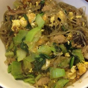 放青菜翻炒,锦粉面事先开水槽过软一点好炒。