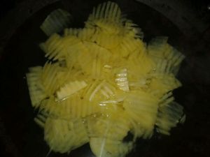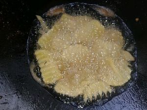 土豆片凉了之后便放入冰箱、想吃的时候拿出来往锅中一炸三分钟就搞定