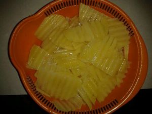 锅中水开后、将土豆片捞起后放入锅中煮、煮至水有点小开、捞起泡冷水、这样就半成品了