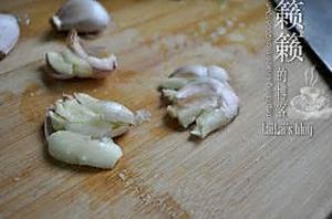蒜瓣冲洗干净,也用刀拍碎,去皮后稍微斩剁一下放入调味碗中;